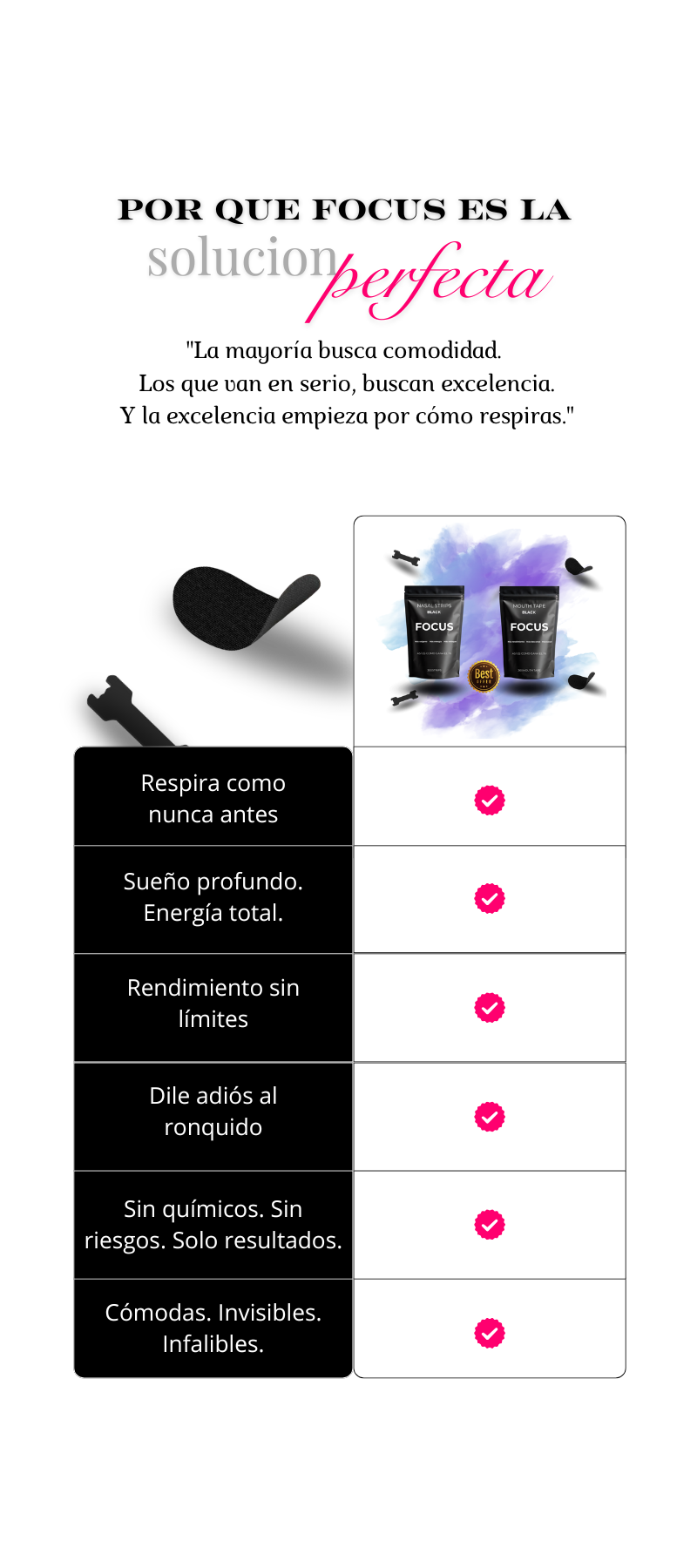 La solución con Focus: Las tiras nasales magnéticas Focus abren suavemente tus fosas nasales para que el oxígeno fluya toda la noche. Duermes profundamente y despiertas con energía real.